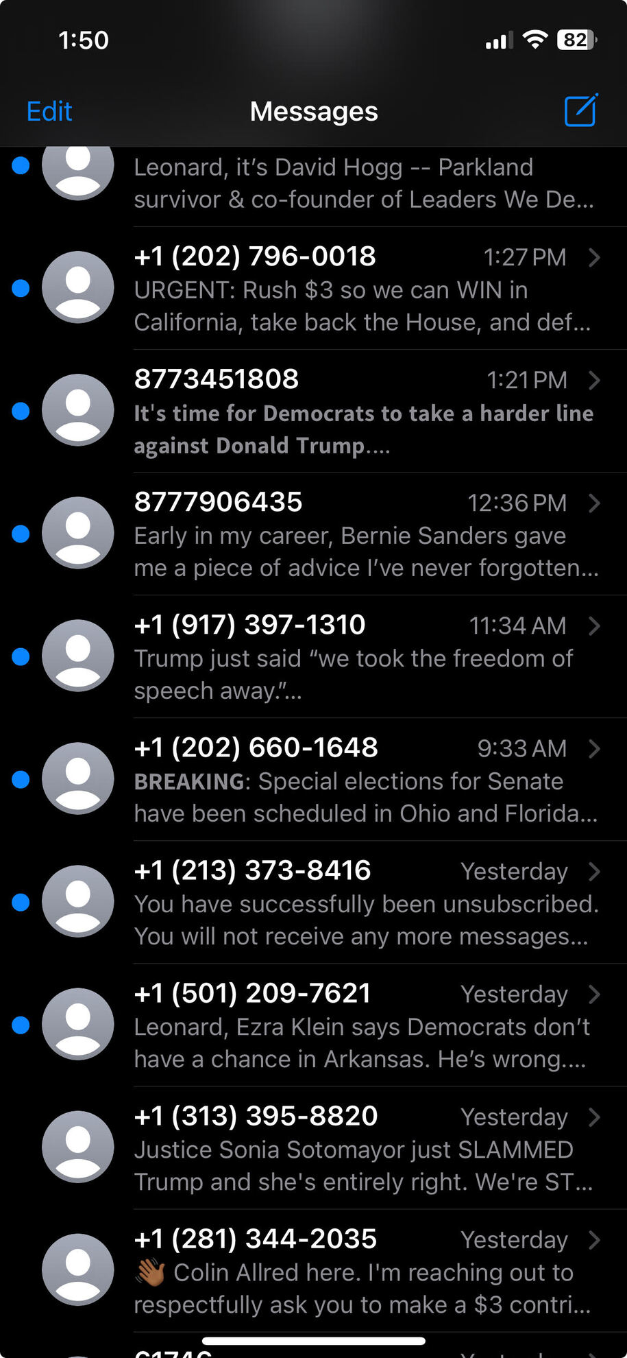 With all the deterioration of our political and social environment as we careen into a fascist necropolis, this diary is rather superfluous. But there has recently been a large increase, a veritable barrage, in the amount of fundraising messages I receive. After the Mr. Kos diary warning of scam PACs and organizations that basically “take the money and run” without disbursing to any organization, I routinely just delete them without opening, and often reply with “stop” unless the message is from an organization I am familiar with. Oft times, I can’t easily ascertain what organization is sending the message. Unfortunately, I can’t read the links in the SMS messages as Apple, in a fit of design elegance, display them in the hardest to see color, an incandescent blue. I have to click on them to see where they lead, usually to an ACT BLUE page. But considering the dozens I receive every day, I don’t feel like I want to take the time or the risk.