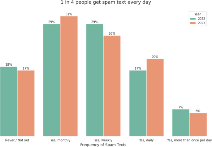 The incidence of SMS spam remains persistently high, particularly within the United States7. observed a notable uptick in spam text activity, with a 58.0% increase reported in 2022. Additionally7, noted that 1 in every 3 Americans encountered fraudulent schemes through spam texts, with 65% of these individuals only realizing they had been deceived after the fact. These findings are corroborated by8, who documented a staggering 157.0% surge in spam texts among Americans, amounting to 225 billion such messages in 2022 alone. Furthermore, Orred’s research revealed that individuals between the ages of 18 and 44 are particularly vulnerable to financial losses from phone scams, with 55.6% being male, 42.2% female, and 2.3% identifying as non-binary. The severity of the issue is graphically depicted in Fig. 1, as presented by9.